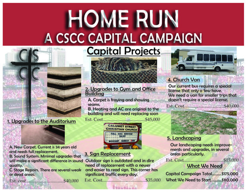 The Home Run Campaign is a capital campaign that the CSCC Board has approved for the future of Calumet Street Christian Church. We have identified key areas in and around the church building that need improvement, upgrades, or replacement, and the cost of doing so. The Board believes this is a vital part of God's vision for our church moving forward. We will raise funds to prepare for the future of Calumet Street.