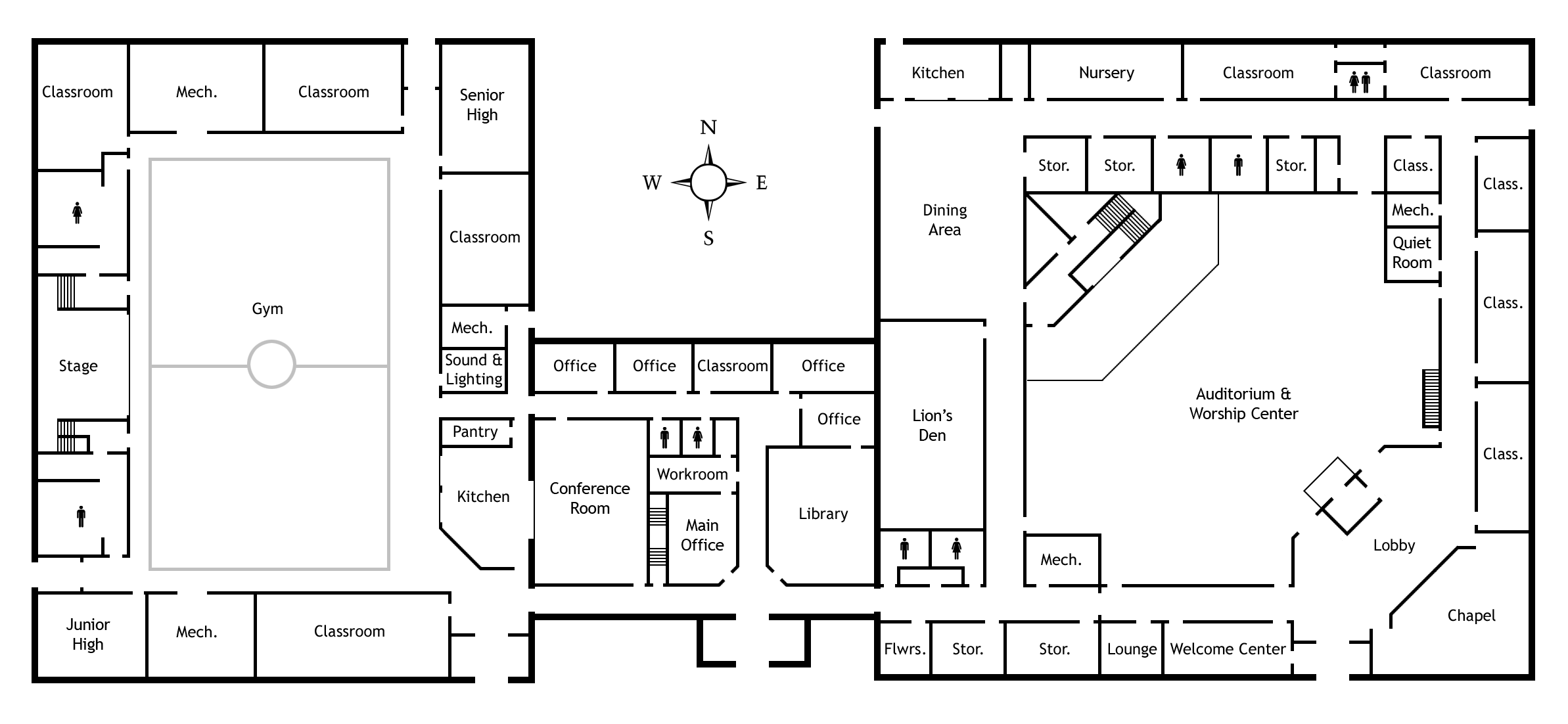 On the east side of CSCC are the Auditorium, Welcome Center, Chapel, and children's classrooms and Nursery. The Gym is on the west side, along with student and adult classrooms. In between are the church offices, the Library, and the Conference Room.
